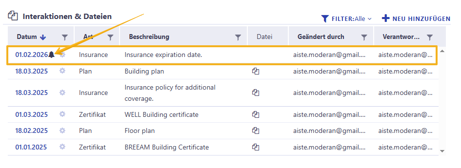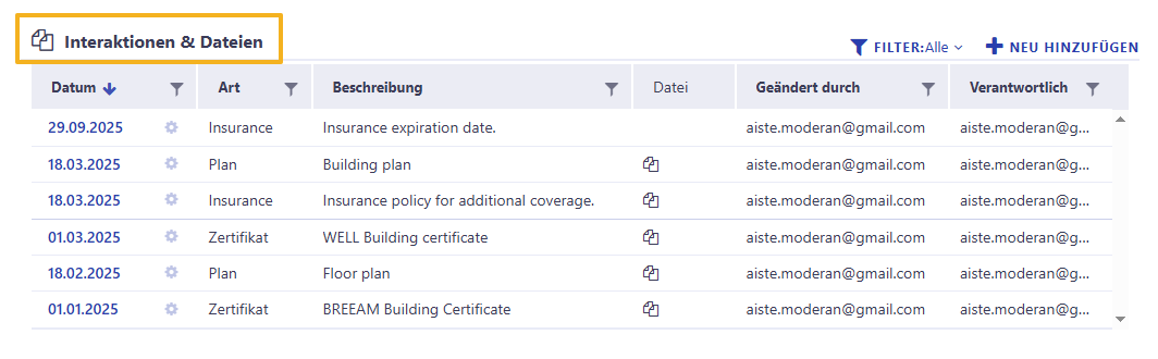 Im Bereich Interaktionen & Dateien können Sie verschiedene Dokumente und Aufzeichnungen von Ereignissen im Zusammenhang mit dem Gebäude speichern.