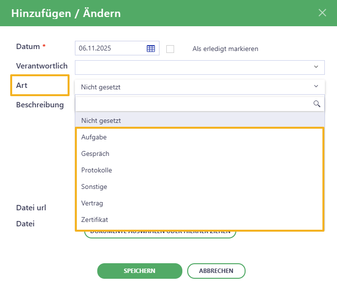 - Art – Wählen Sie aus der Liste der Arten die passende für die hinzuzufügende Datei aus (z. B. Vertrag).