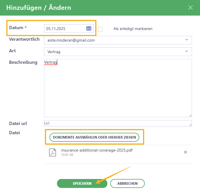 - Datum* – Pflichtfeld. Sie können Dokumente und Interaktionen mit aktuellem Datum oder mit Datum aus der Vergangenheit hinzufügen, falls diese bereits unterzeichnet wurden.