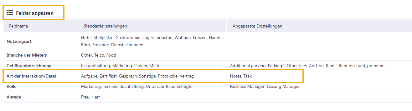 Sie können Ihre eigenen Arten unter „Admin > Einstellungen > Felder anpassen" erstellen (nur für Admin-Nutzer:innen verfügbar):