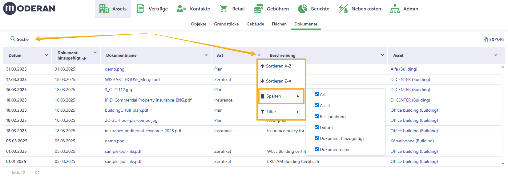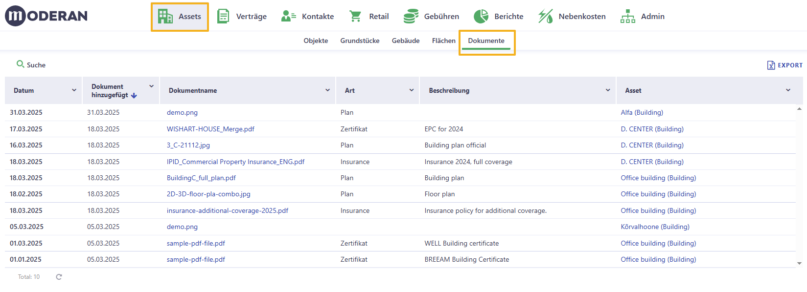 Dieser Bereich ist unter Assets > Gebäude sowie unter Verträge > Mietverträge, Dienstleistungsverträge und Anfragen verfügbar. Er hat überall in Moderan die gleiche Funktionsweise.