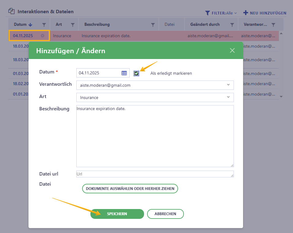 Hinweis! Standardmäßig wird eine Interaktion automatisch als erledigt markiert, wenn Sie sie mit dem heutigen Datum oder einem Datum in der Vergangenheit (= nicht in der Zukunft) hinzufügen.Arten von Interaktionen & Dateien