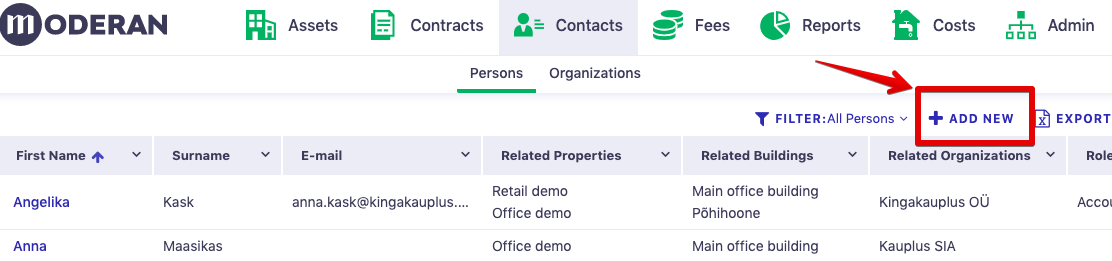 - Go to the Rental Contract card, and scroll down to the Persons block. Click +ADD NEW: