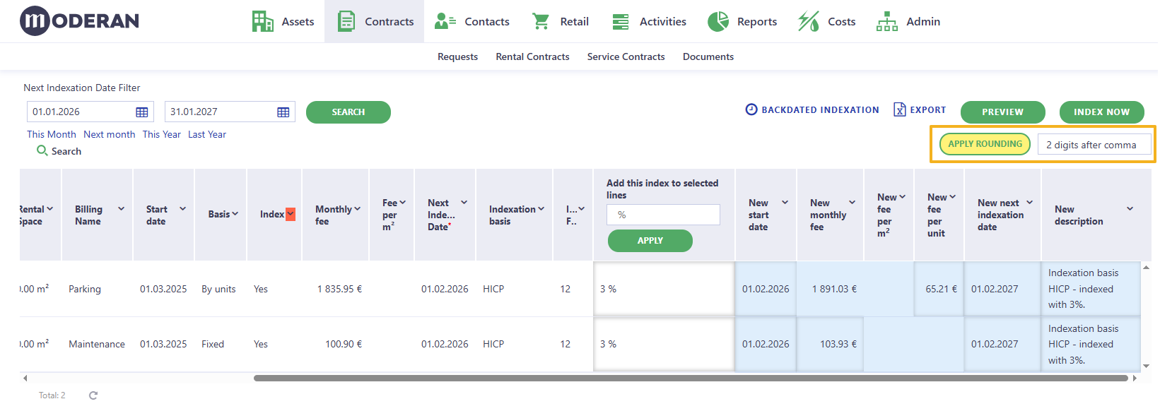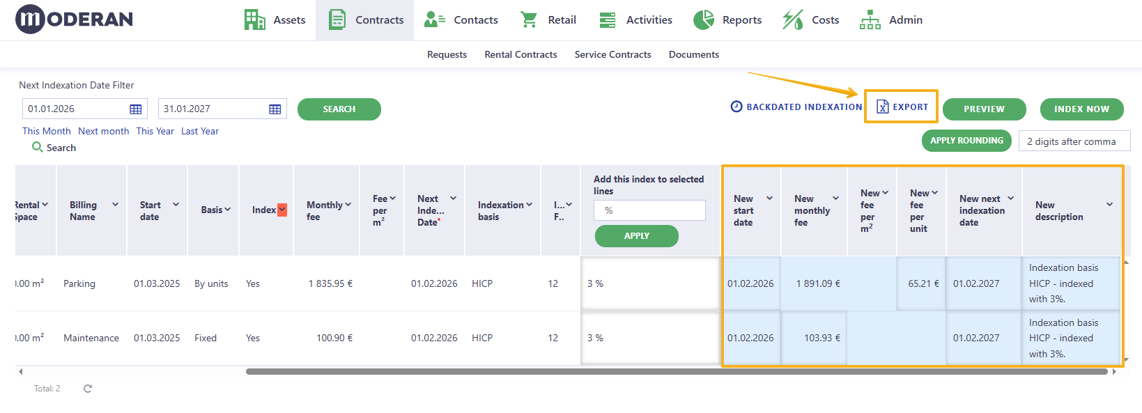 - Once you click INDEX NOW, new billing lines with indexed values are created in Rental Contracts (Rent and Fees table).