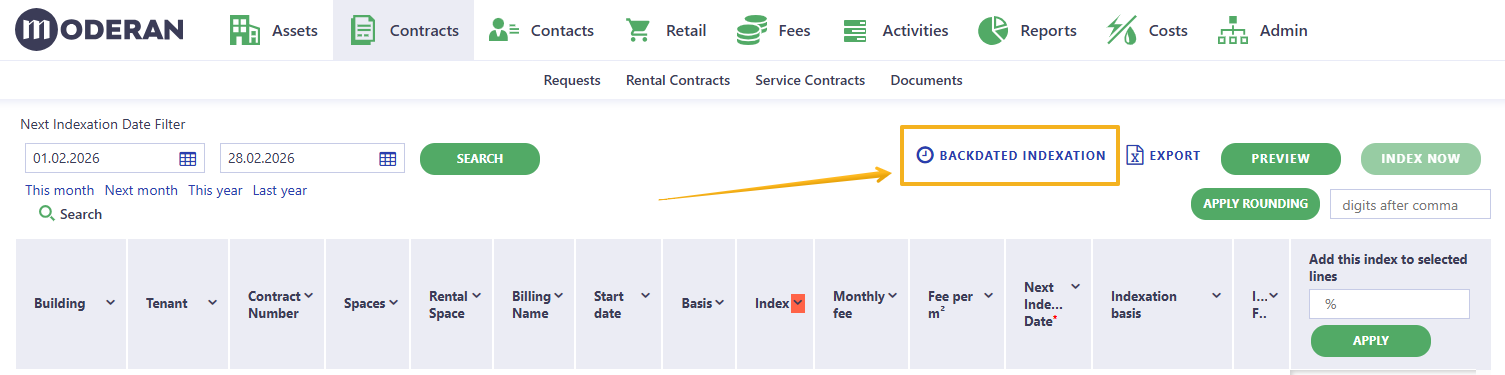 ▶ Contracts > Rental Contracts > % START INDEXATION > BACKDATED INDEXATION