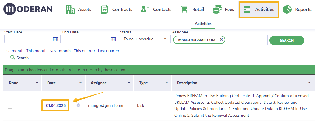 - Create a Task with a clear description (e.g. Renew BREEAM certificate). If needed, include additional instructions as steps in the description.
