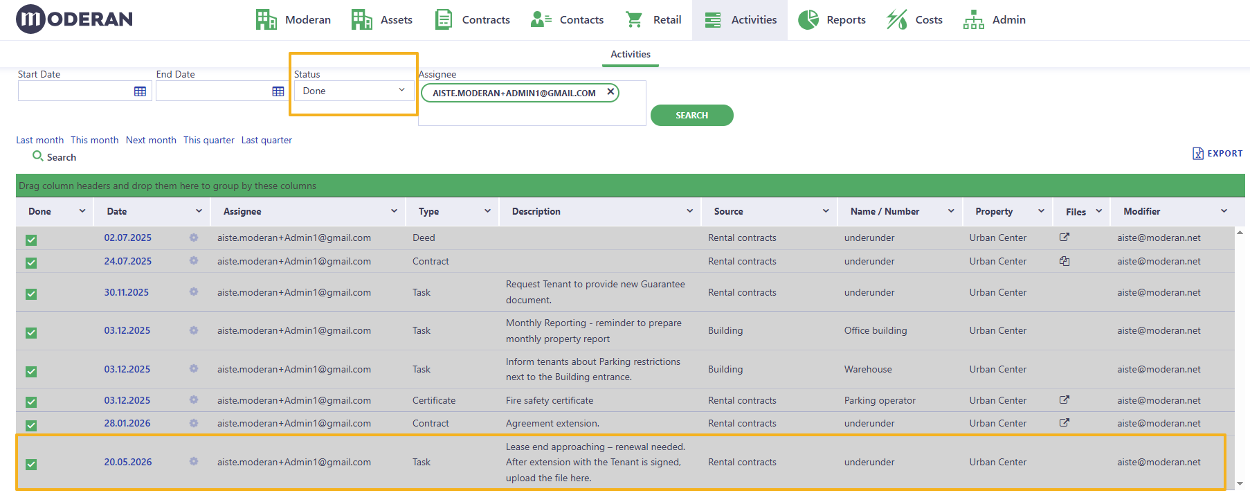 - Once the task is marked as Done, it is removed from the active task list in Activities and serves as a record that the lease renewal process has been completed.