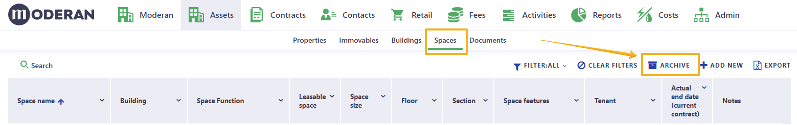 - Is automatically moved into the ARCHIVE section in Assets > Spaces list view. The archived Spaces remain visible in Moderan for historical reporting. This ensures that reports referencing past leases and space usage remain intact.