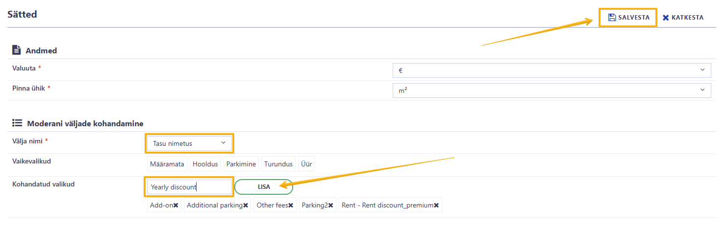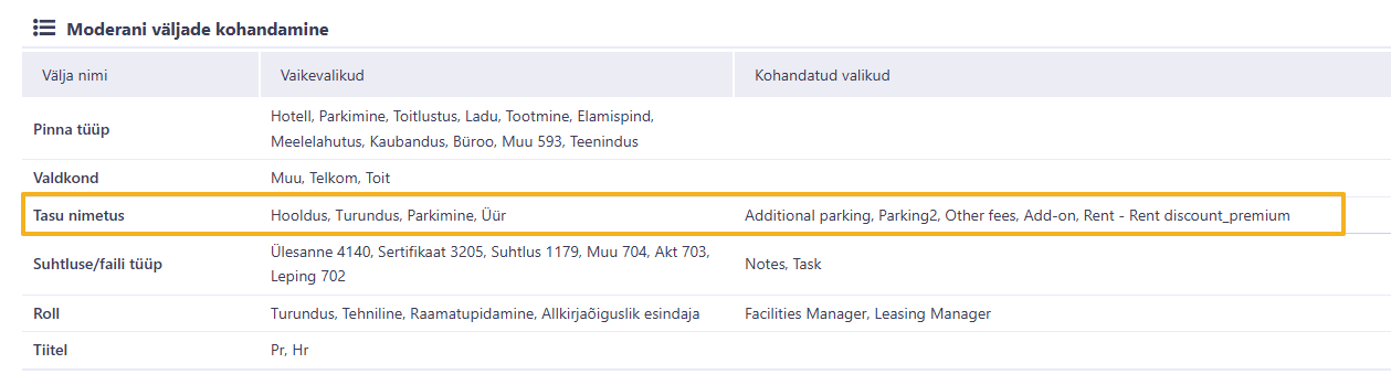 - Kui näete uut tasutüüpi Admin jaotises, kuid te ei saa seda üürilepingutesse lisada, vajutage F5 või värskendage veebilehte.