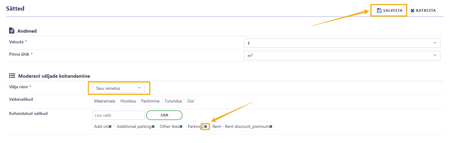 NB! Kohandatud üüri/tasu saab kustutada ainult siis, kui seda kusagil ei kasutata!NB! Kui soovite muuta kohandatud üüri/tasu tüübi nime, mis on juba kasutuses olnud, palun edastage oma soov Moderani vestlusaknas või saatke aadressile support@moderansolutions.com. Sealjuures täpsustage üksikasjad (vana nimetus, uus nimetus ja kinnitus muutmise kohta).