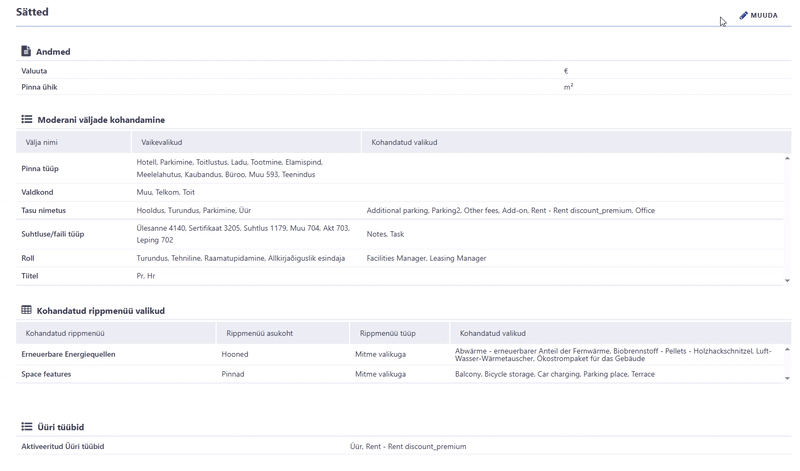 Moderanil on mitu vaikimisi üüri ja tasude tüüpi (Üür, Parkimine, Turundus, Hooldus), kuid admin õigusega kasutajad saavad lisada neid juurde – näiteks allahindlus, fikseeritud kommunaalkulud jmt.