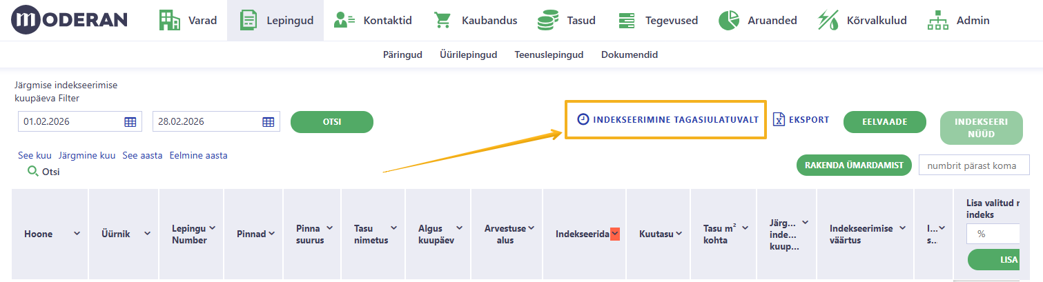 Liigu menüüs Lepingud > Üürilepingud > % ALUSTA INDEKSEERIMIST > INDEKSEERIMINE TAGASIULATUVALT