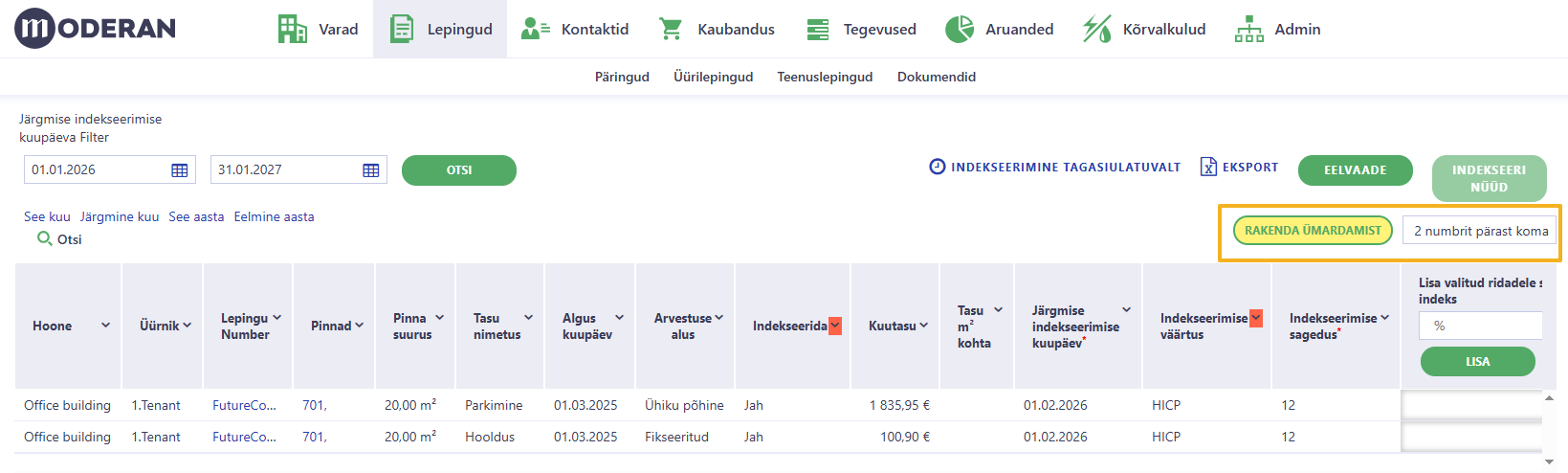 ▶ Lepingud > Üürilepingud > % ALUSTA INDEKSEERIMIST