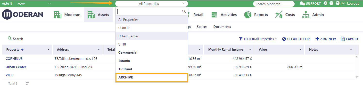 NB! Arhiveeritud objekti ei saa kasutaja poolt tagasi võtta ega redigeerida, isegi mitte adminõigustega kasutaja. Kui objekt on kogemata arhiveeritud või arhiveerimiskuupäev on vale (see mõjutab otseselt aruandeid), võtke ühendust Moderani toega - support@moderansolutions.comKui esimene Objekt arhiveeritakse, luuakse grupp ARHIIV automaatselt peamise filtri alla: