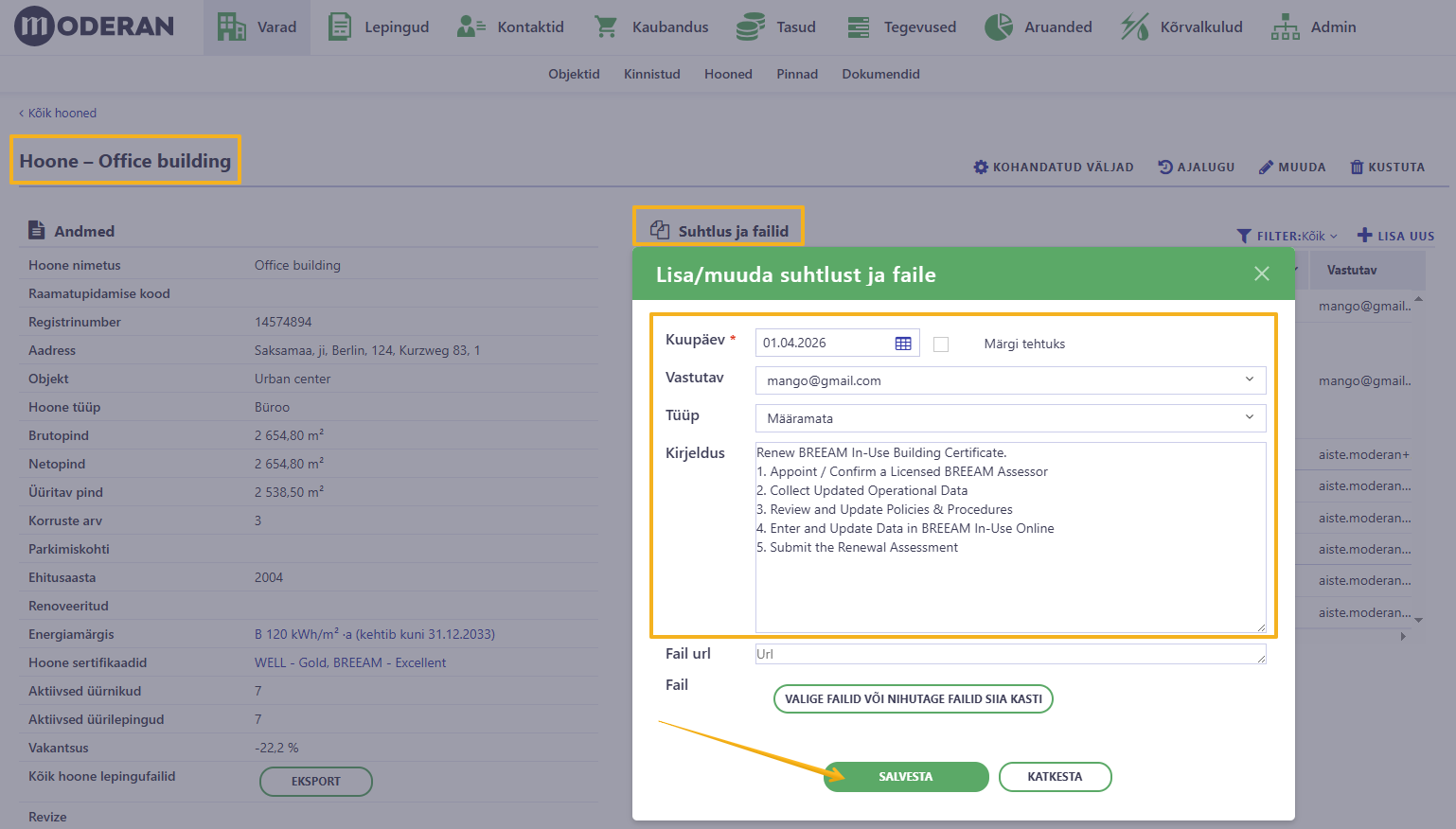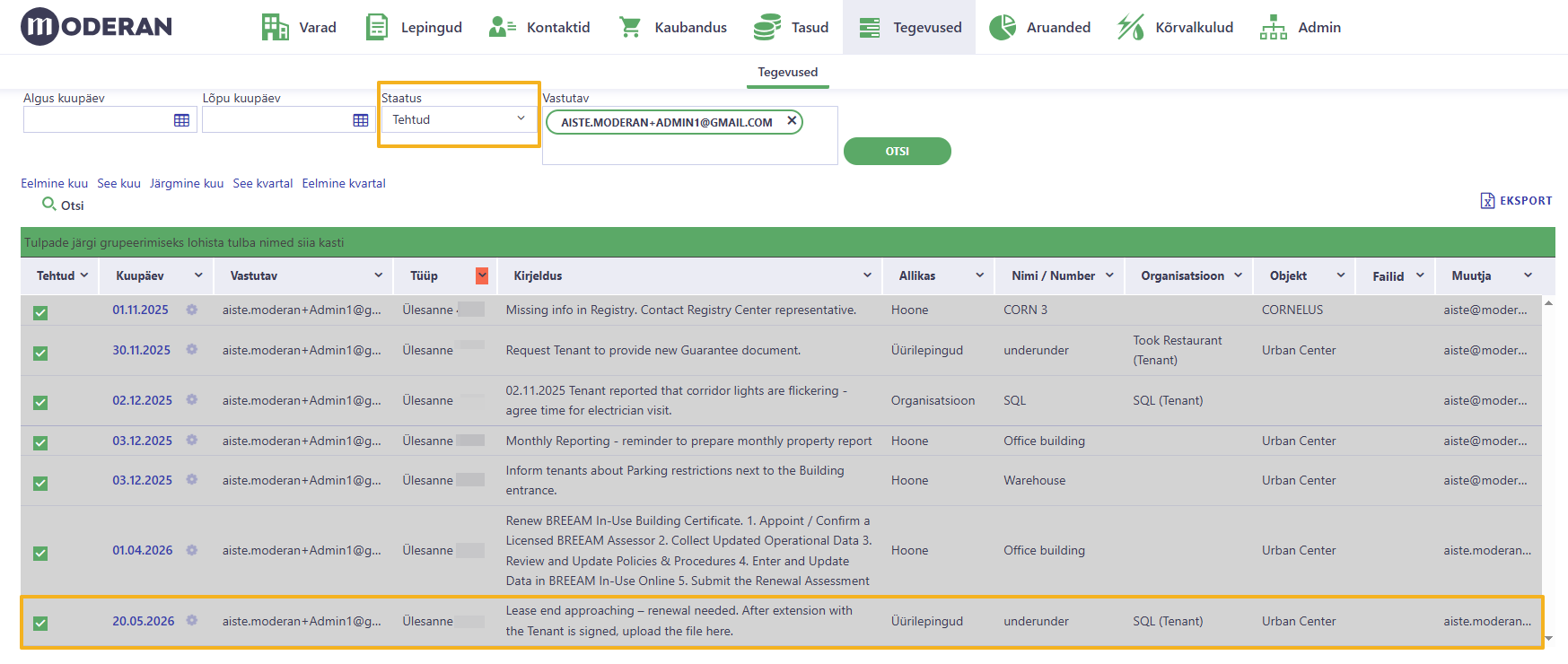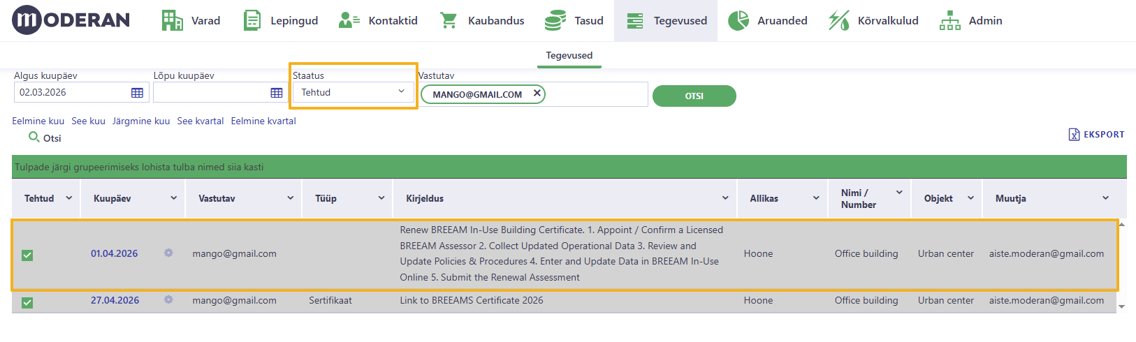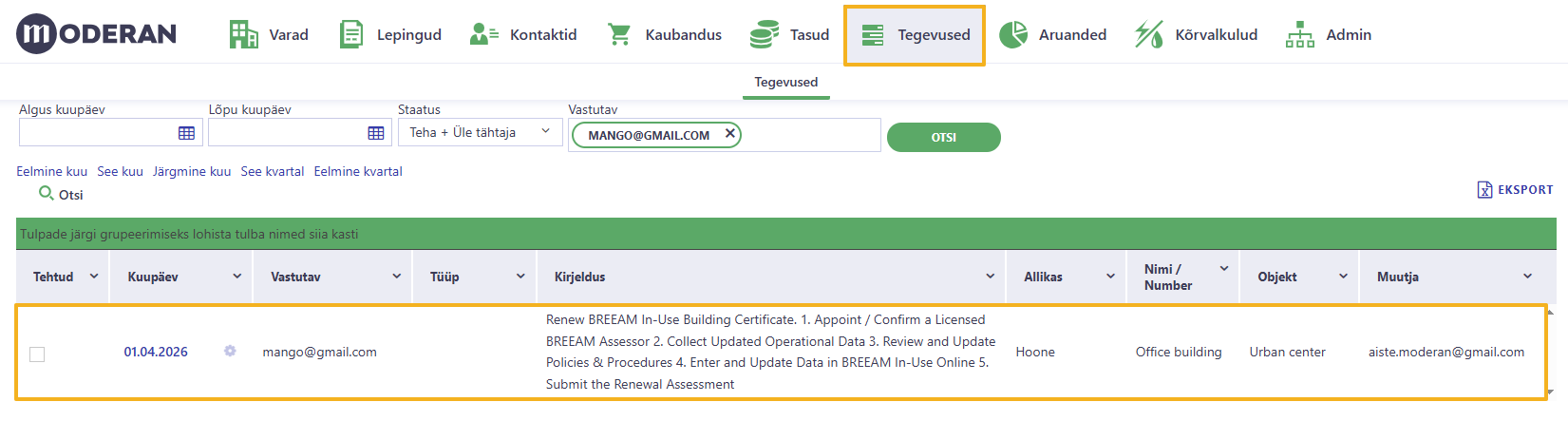 Järgnevalt on kirjeldatud kahte näidet, kuidas Moderanis tegevusi kajastada ja hallata: hoone sertifikaatide uuendamine ja üürilepingute pikendamine.