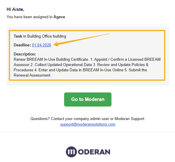 - Loo ülesanne selge kirjeldusega (nt BREEAM-sertifikaadi uuendamine). Vajadusel lisa kirjeldusse lisajuhised.