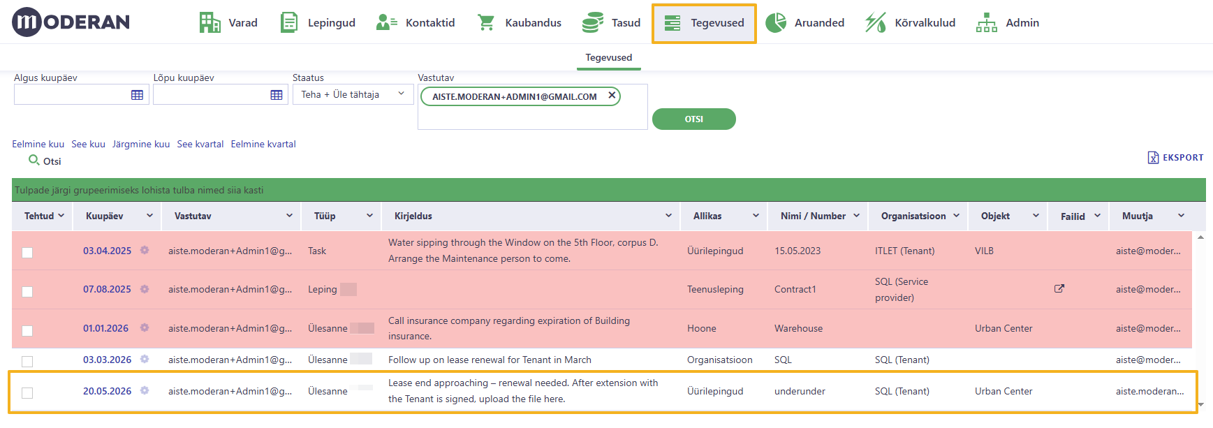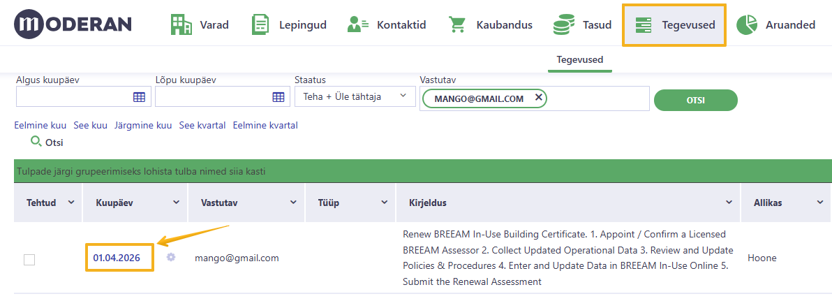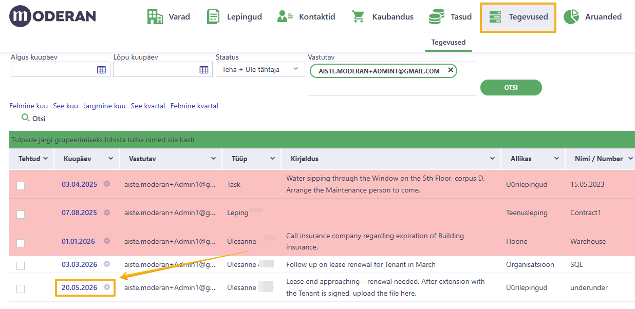 Vihje: tegevusele pääseb ligi kõige mugavamalt tegevuste loendi kaudu. Tegevuse kuupäevale klõpsates avaneb automaatselt õige asukoht, kuhu ülesanne loodi (antud juhul - üürileping).