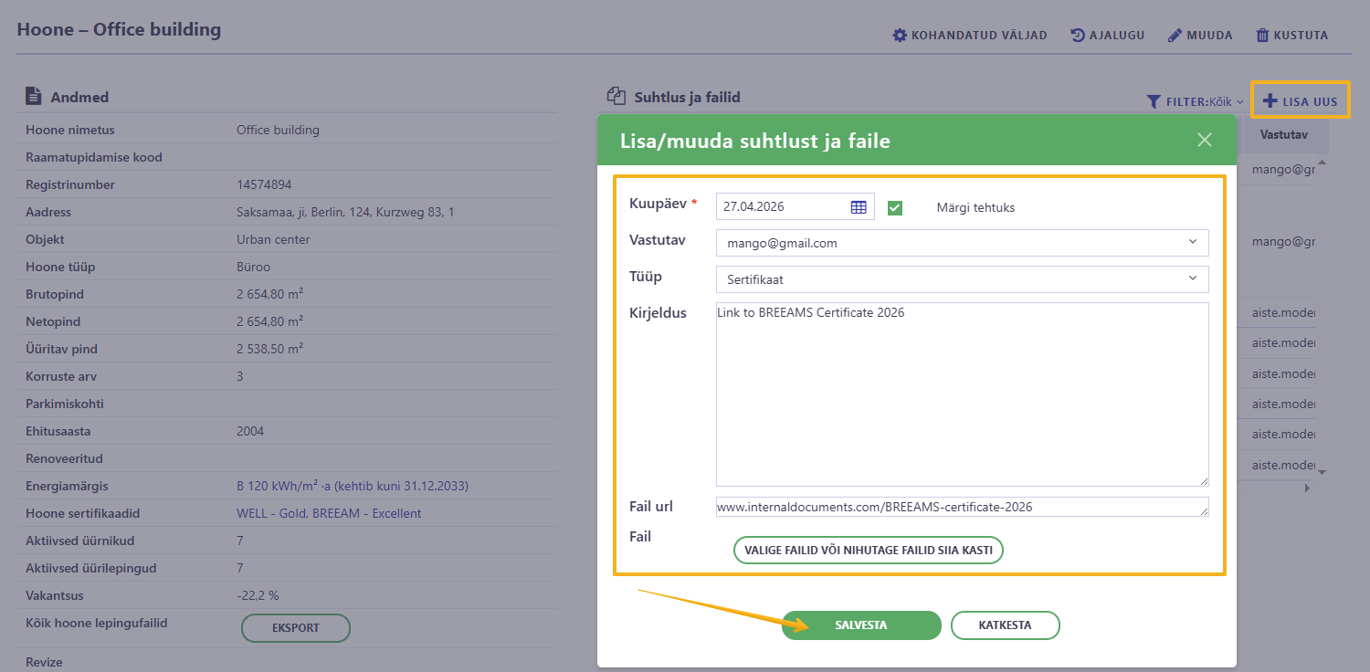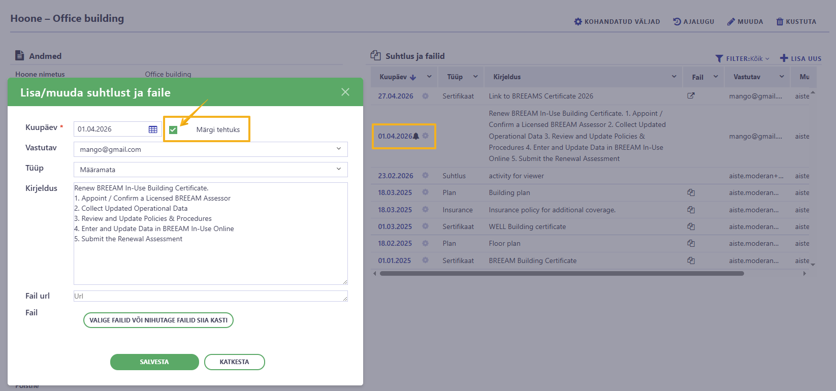 Eesmärk: Lisada ülesanne ja täitmise tähtaeg, uuendada sertifikaat hoone kaardil ja lõpetada ülesanne.1. samm – loo ülesanne jaotises „Suhtlus ja failid”