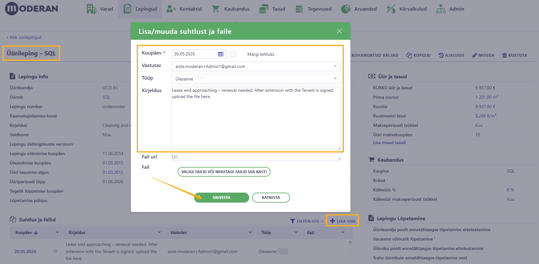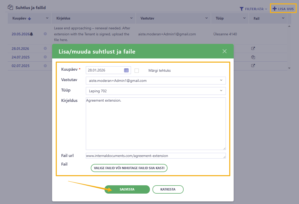 - Lisage üürilepingu pikendamise kokkulepe või sellega seotud dokumendid jaotisse „Suhtlus ja failid“.