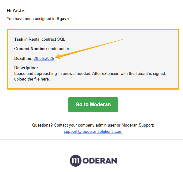 Eesmärk: luua ülesanne, mis teavitab üürilepingu haldurit üürilepingu lõppemise lähenemisest, pikendada üürilepingut, uuendada lepingut Moderanis ja sulgeda ülesanne.1. samm – loo ülesanne üürilepingu pikendamiseks