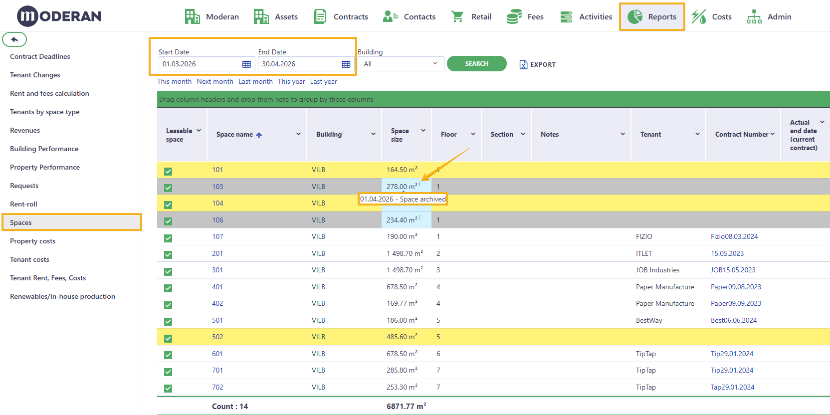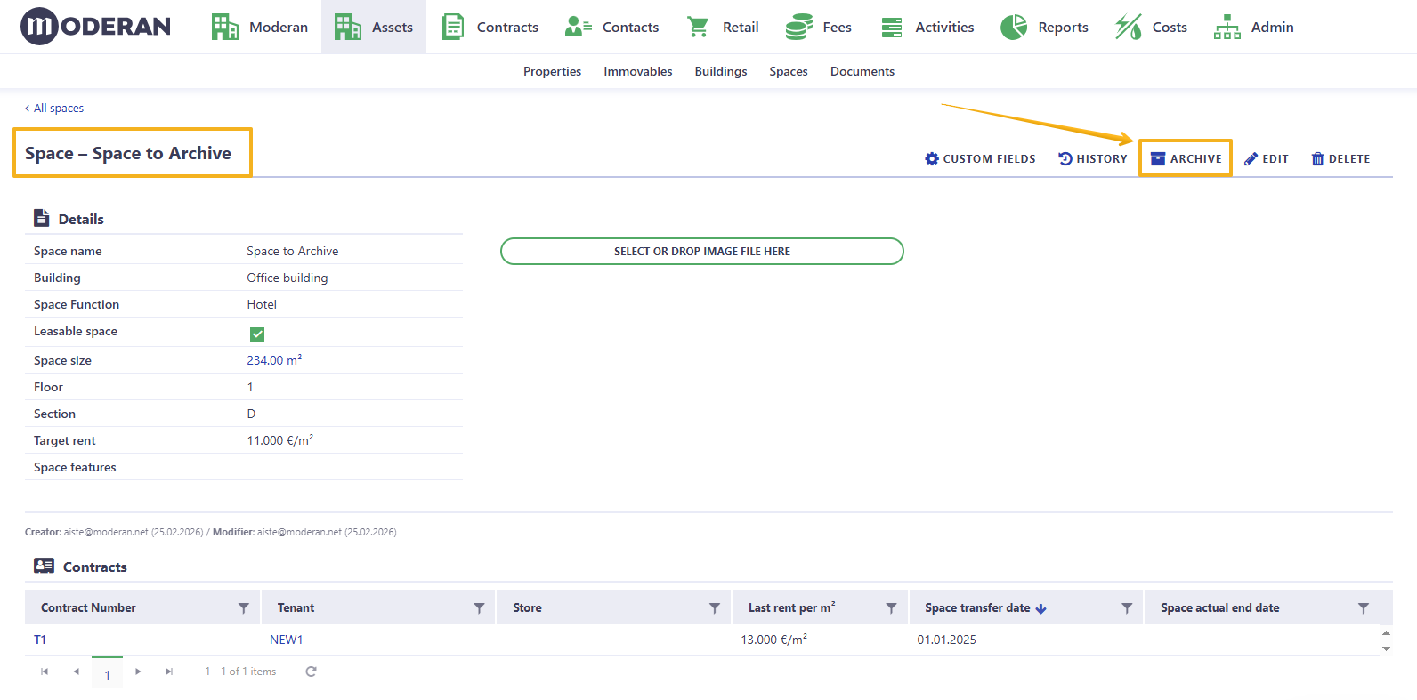 - Is automatically moved into the ARCHIVE section in Assets > Spaces list view. The archived Spaces remain visible in Moderan for historical reporting. This ensures that reports referencing past leases and space usage remain intact.